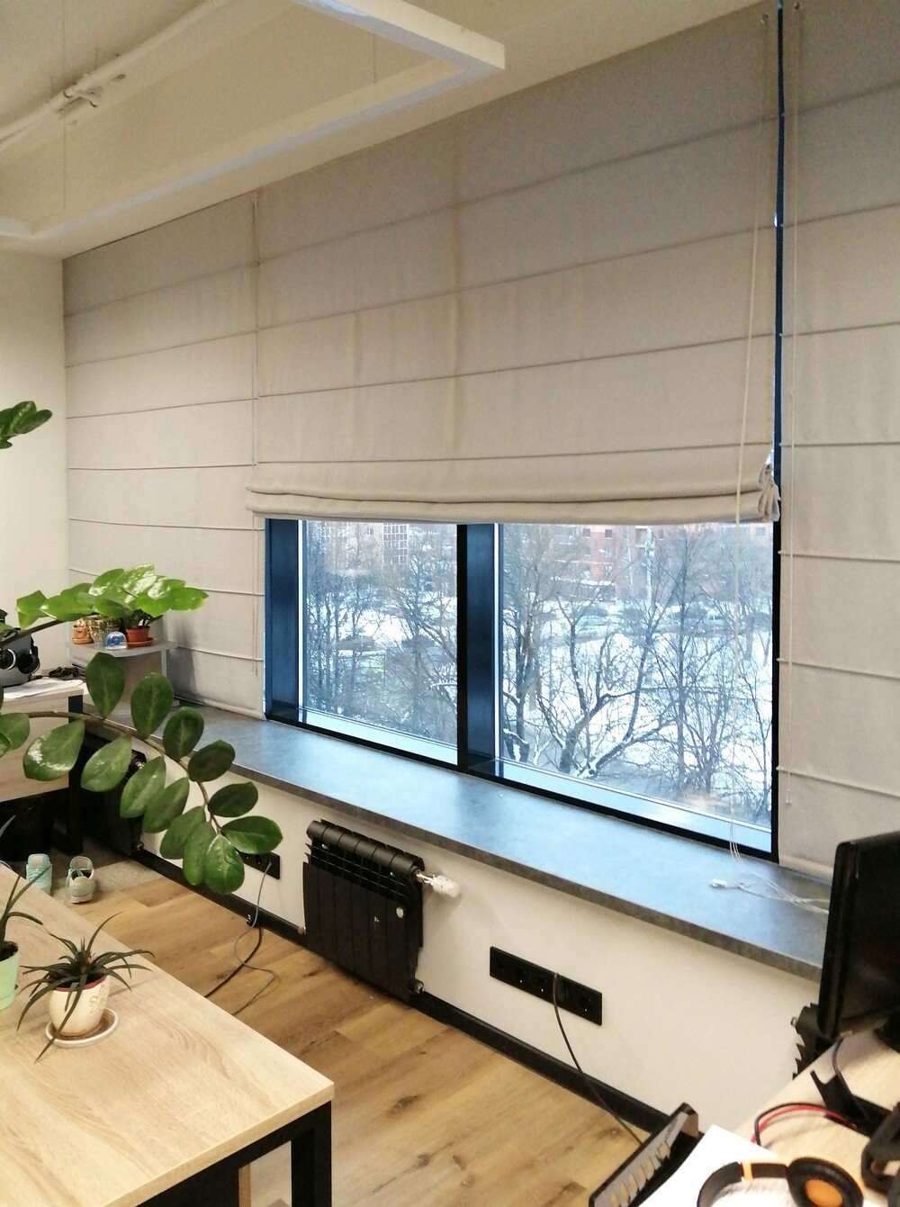 - Компактность. Штора вплотную прилегает к стеклу, освобождая подоконник для цветов или предметов декора.